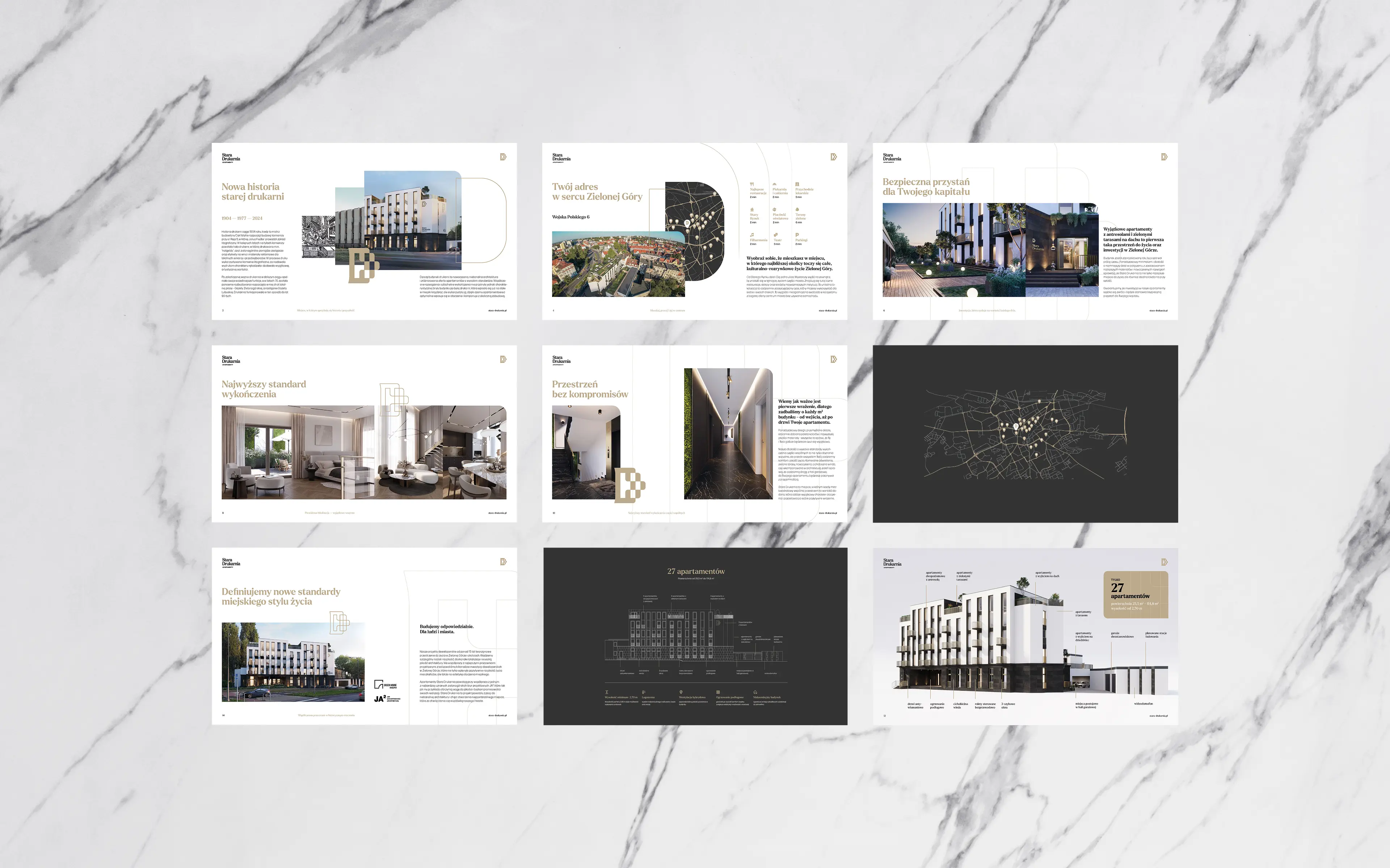 Ca艂o艣膰 uzupe艂ni艂y materia艂y drukowane i foldery sprzeda偶owe, przygotowane na szlachetnych papierach z wykorzystaniem tradycyjnych technik, kt贸re wzmocni艂y wizerunek marki i budowa艂y zaufanie odbiorc贸w.