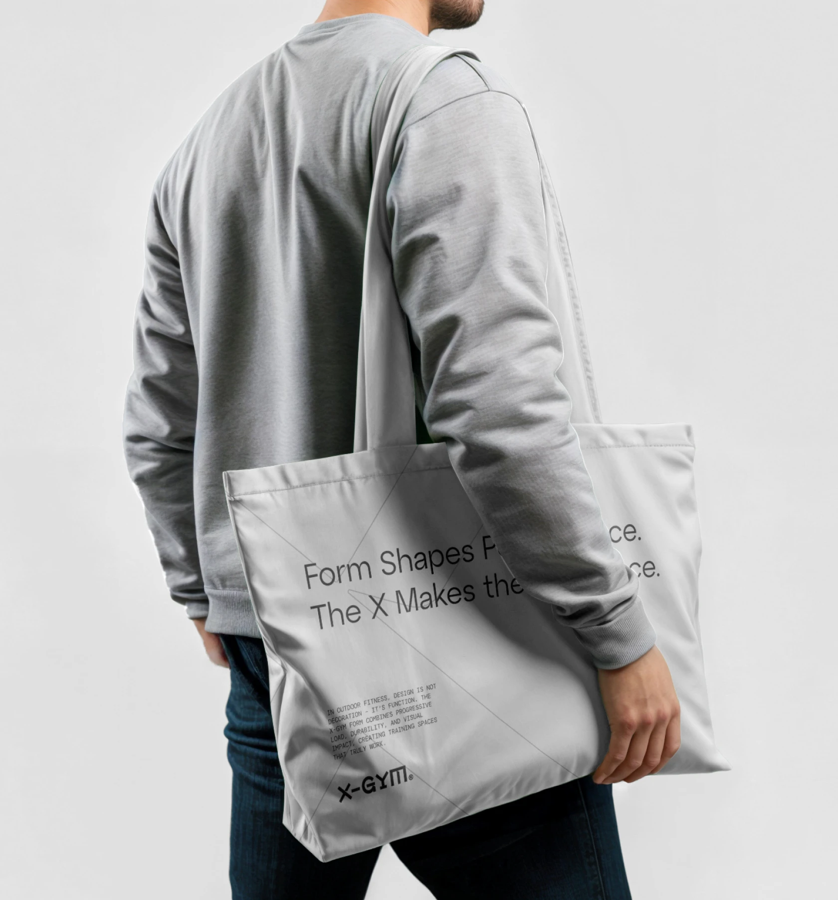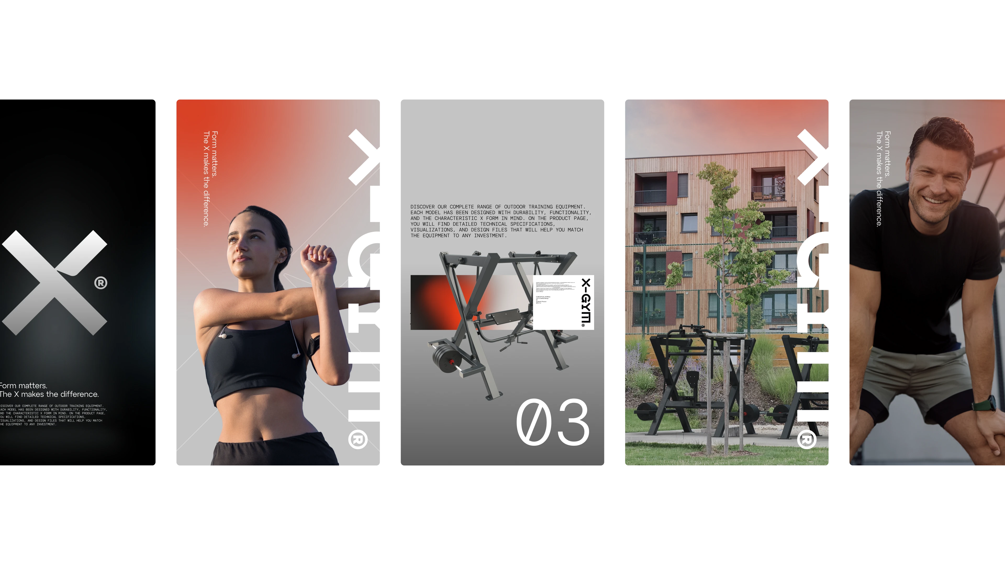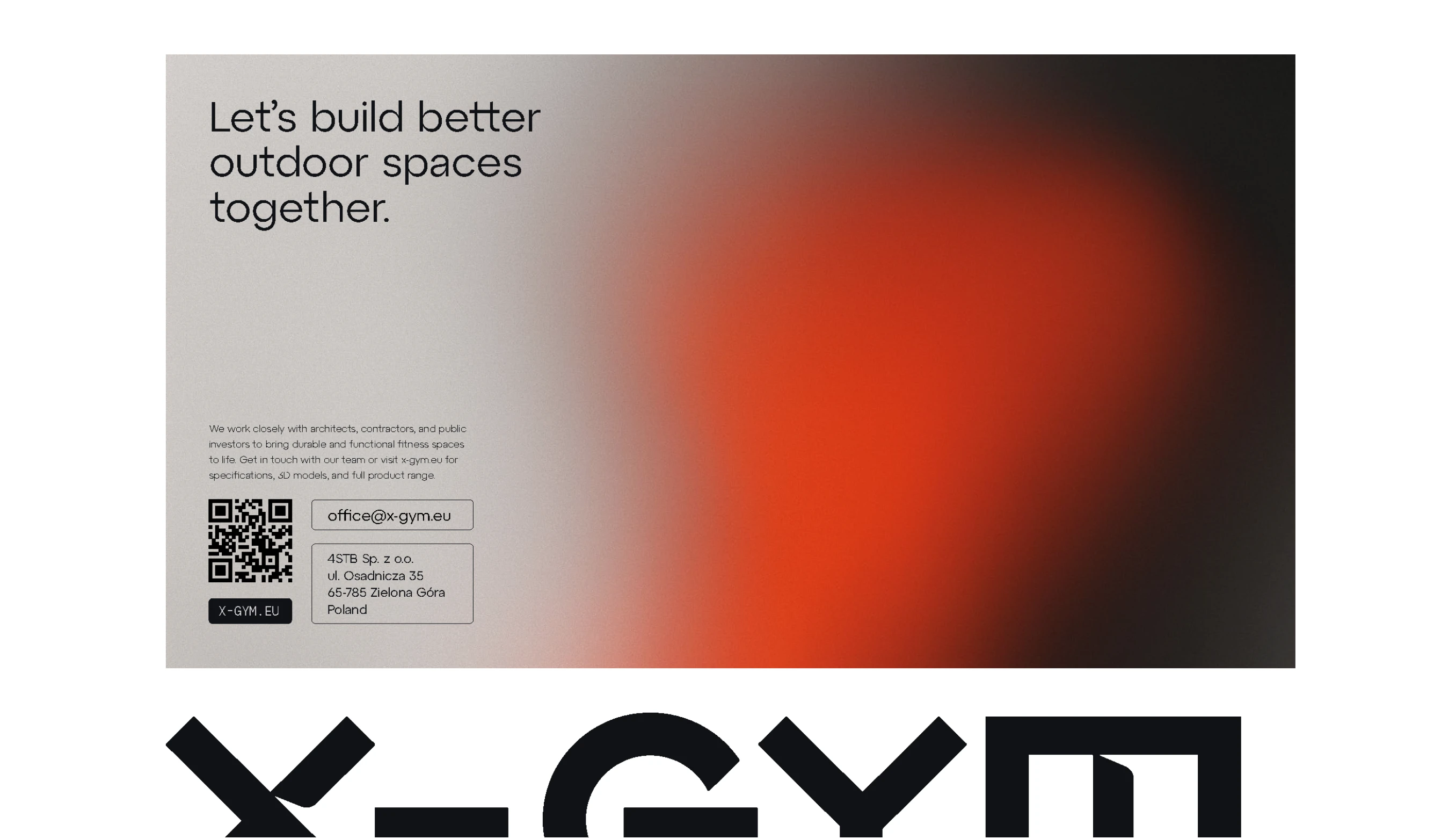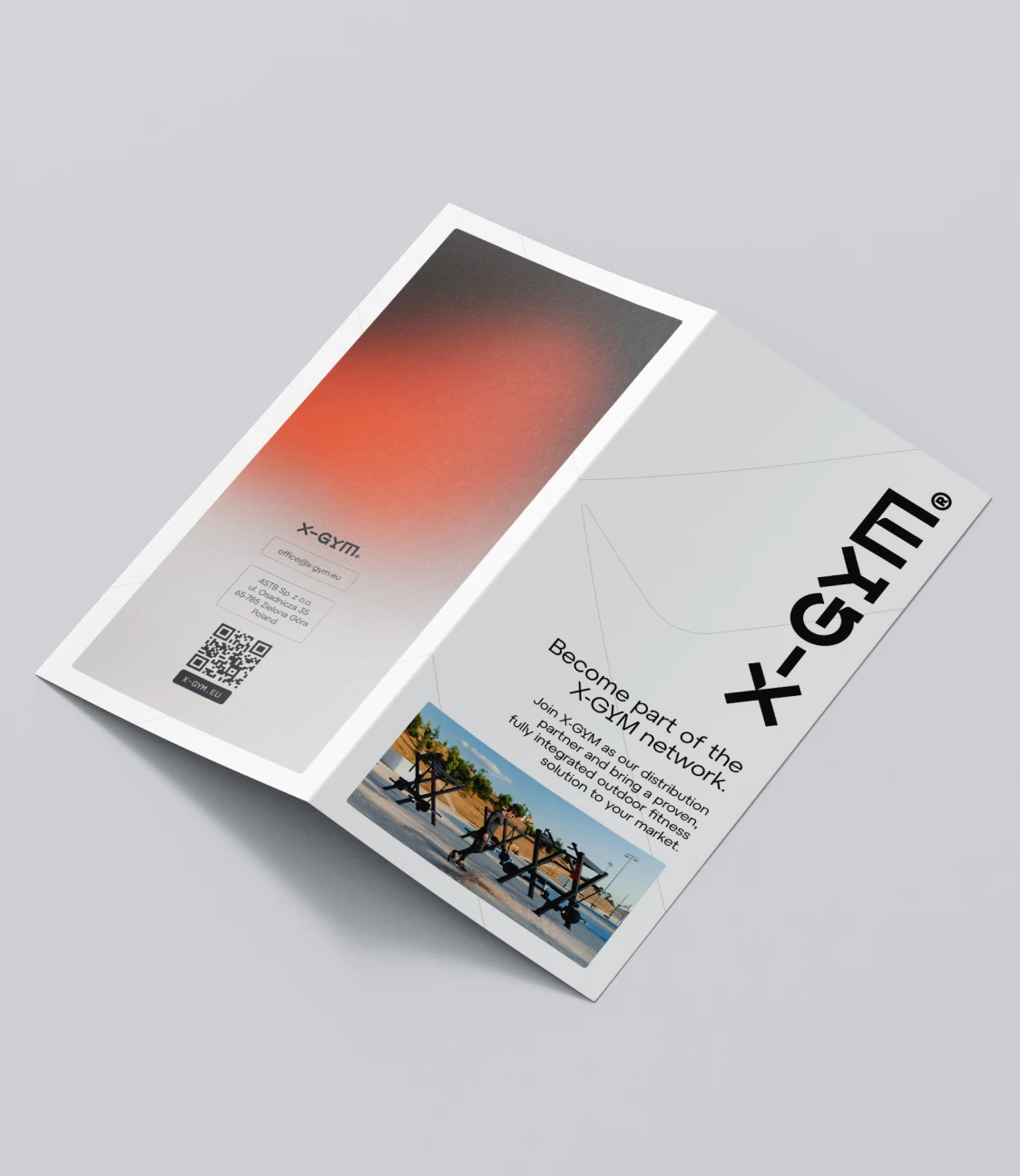 Kluczowym elementem projektu stał się znak „X” - symbol siły i równowagi, który bezpośrednio odwołuje się do charakterystycznego wyglądu urządzeń X-GYM. Inspiracją do całego znaku graficznego były masywne formy urządzeń do street workoutu, które podkreślają wytrzymałość i solidność System identyfikacji zaprojektowaliśmy tak, aby działał w przestrzeni miejskiej, hotelowej, wojskowej czy deweloperskiej, a jednocześnie był czytelny dla decydentów B2B i osób przygotowujących przetargi.